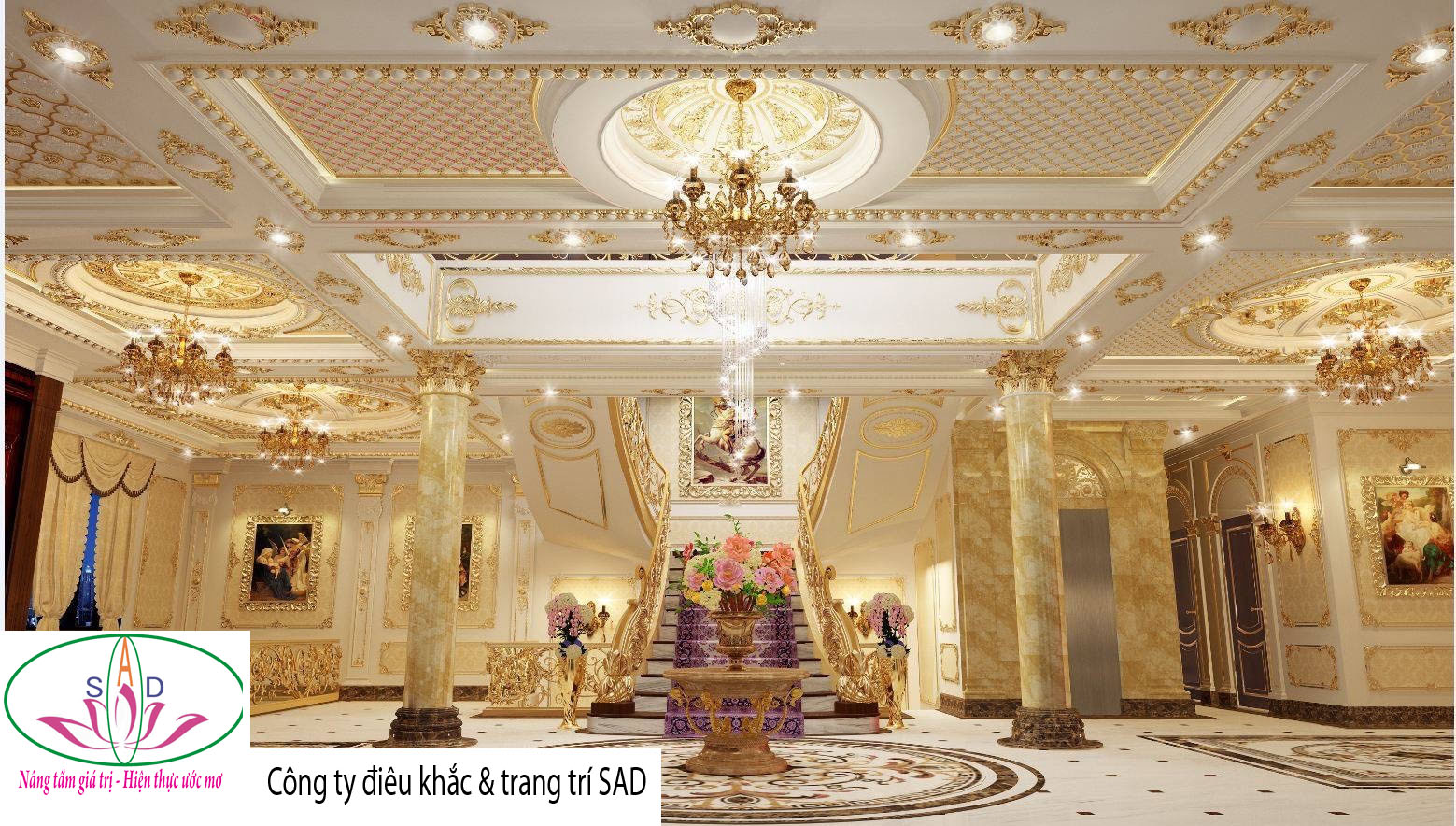 Phòng khách thiết kế với vật liệu trang trí nhựa PU cao cấp được dát vàng sang trọng, thể hiện sự cao sang quyền quý và tính cách của gia chủ.